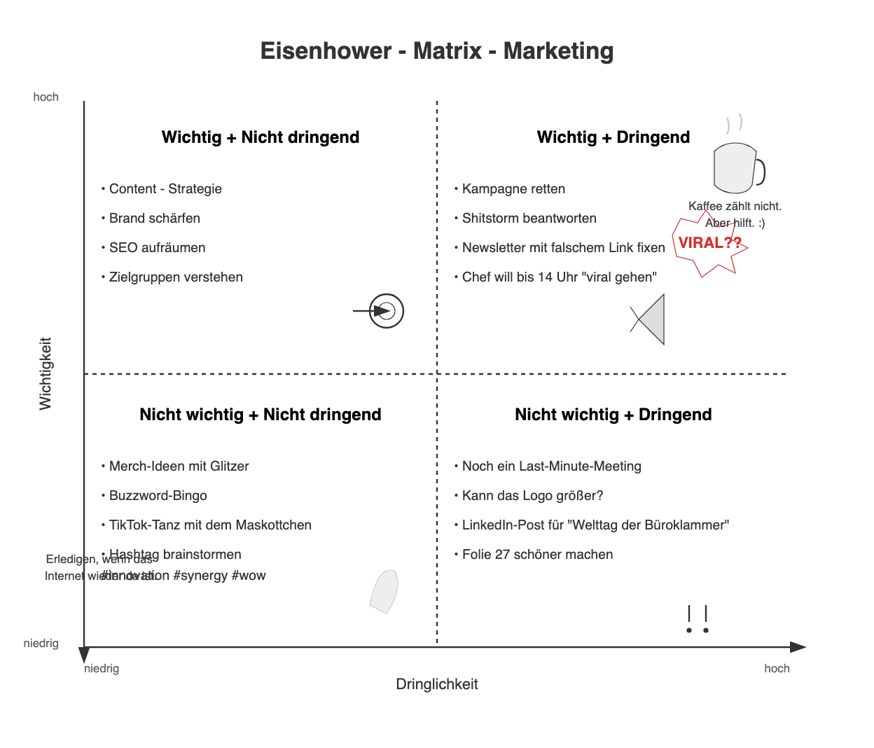 Die 2×2-Eisenhower-Matrix mit Achsen, Quadranten und fast allen Textinhalten ist klar übernommen; auch mehrere Deko-Elemente wie Tasse, VIRAL-Stern, Zielscheibe und Ausrufezeichen sind vorhanden. Die Beschriftungen sind überwiegend korrekt, aber links unten überlagert der Kommentar („Erledigen, wenn das Internet wieder da ist.“) die Hashtag-Zeile stark, und einige Illustrationen sind vereinfacht oder leicht verschoben. Gruppierung und Diagrammtyp passen sehr gut, doch die Lesbarkeit leidet etwas durch Überlappungen unten links und uneinheitliche Platzierung einzelner Randnotizen.