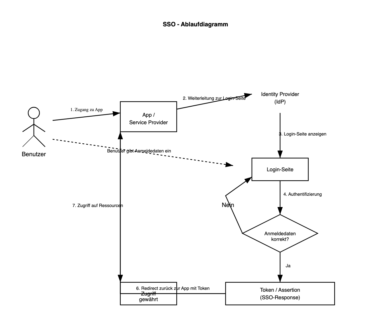 Die Hauptknoten aus dem Original sind fast alle vorhanden, inklusive Benutzer, App/Service Provider, Login-Seite, Entscheidungsdiamant und Zugriff gewährt; der Identity Provider ist jedoch nicht als umrandete Box dargestellt und das Token/Assertion-Element wurde als Box statt nur als ausgehender Schritt gezeichnet. Mehrere Labels sind semantisch korrekt, aber einige Texte sind falsch platziert oder kollidieren, insbesondere „Benutzer gibt Anmeldedaten ein“ und „6. Redirect zurück zur App mit Token“. Topologisch weicht der Ablauf sichtbar ab: Der gestrichelte Benutzerpfad endet nicht sauber an der Login-Seite, der Nein-Pfad ist anders geführt, und Schritt 6/7 mit Zugriff gewährt ist gegenüber dem Original umverdrahtet. Als Ablaufdiagramm klar erkennbar, aber das Layout wirkt roh mit überlappenden Linien, uneinheitlicher Platzierung und teils schwer lesbaren Beschriftungen.