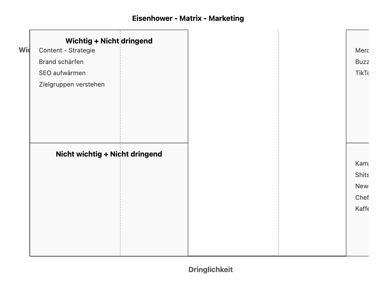 Die 2×2-Eisenhower-Matrix als Diagrammtyp ist grundsätzlich erkannt, und mehrere Quadranten-Titel sowie einige Listenpunkte sind vorhanden. Der Render ist aber stark abgeschnitten: rechter Teil und Achsenbeschriftung links sind teilweise außerhalb des Bilds, viele Texte im rechten Bereich sind nur fragmentarisch sichtbar, und dekorative Elemente aus dem Original fehlen fast vollständig. Gruppierung durch die vier Quadranten ist erkennbar, aber die Lesbarkeit leidet deutlich unter dem fehlerhaften Zuschnitt und den abgeschnittenen Labels.