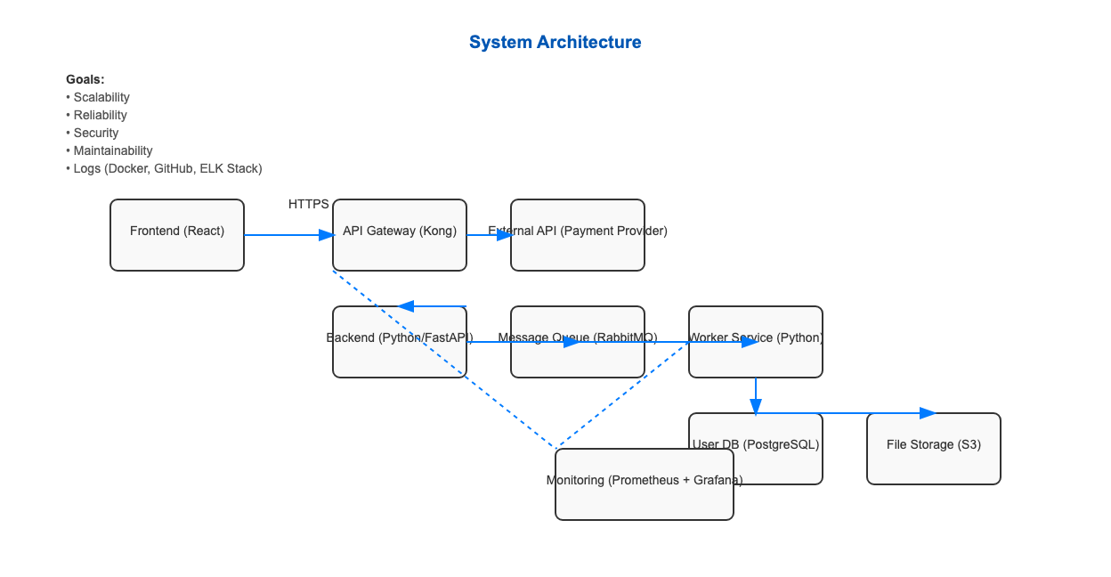 Die Hauptknoten wie Frontend, API Gateway, Backend, Message Queue, Worker, Monitoring und File Storage sind vorhanden, aber Auth Service und die separate Database fehlen; stattdessen taucht nur eine User-DB an anderer Stelle auf. Mehrere Verbindungen stimmen topologisch nicht: API Gateway führt fälschlich zur External API, Backend zeigt nach links zur API statt von ihr angesteuert zu werden, und Worker/File Storage sowie Monitoring-Anbindungen weichen deutlich vom Original ab. Die Pfeilrichtungen sind mehrfach falsch, besonders bei Backend, Worker→File Storage und der Behandlung der asynchronen Kanten. Das Layout bleibt lesbar, wirkt aber roh; außerdem gehen die farblich angedeuteten Gruppen/Subsysteme des Originals fast vollständig verloren.