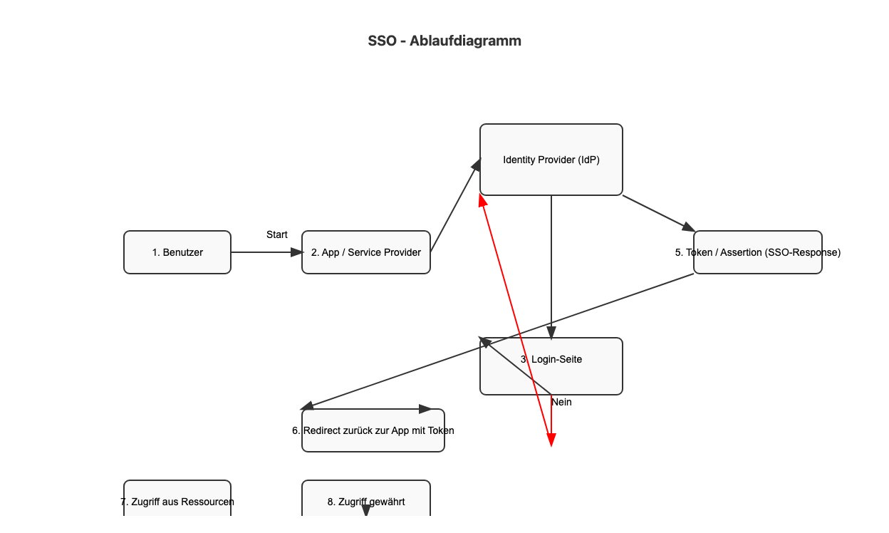 Die Hauptstationen Benutzer, App/Service Provider, Identity Provider, Login-Seite, Redirect und Zugriff gewährt sind vorhanden, aber die Entscheidungsraute „Anmeldedaten korrekt?“ fehlt komplett und dadurch bricht die zentrale Logik des Ablaufs weg. Mehrere Labels sind vereinfacht oder falsch platziert: „5. Token / Assertion“ steht als eigene Box statt als beschrifteter Schritt, „8. Zugriff gewährt“ weicht vom Original ab, und „Nein“ hängt ohne klaren Rückweg. Die Verbindungen stimmen nur teilweise: Der Ja/Nein-Zweig der Entscheidung ist nicht korrekt nachgebildet, mehrere Pfeile enden an falschen Knoten oder frei im Raum, und eine rote Diagonale wirkt wie ein Fehlartefakt. Insgesamt bleibt es als Sequenz-/Ablaufdiagramm erkennbar, ist aber topologisch und hinsichtlich Pfeilrichtung deutlich fehlerhaft und nur mäßig lesbar.