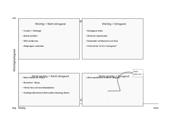 Die 2×2-Eisenhower-Matrix mit Achsen und vier Quadranten ist grundsätzlich vorhanden, daher ist der Diagrammtyp gut getroffen. Mehrere zentrale Beschriftungen fehlen oder sind schlecht lesbar: Der Titel fehlt praktisch, die Quadrantenüberschriften im unteren Bereich überlagern sich, Achsenlabels sind teils abgeschnitten, und die dekorativen/ergänzenden Texte rechts wurden nur als kleines unleserliches Kästchen angedeutet. Verbindungen spielen hier kaum eine Rolle und die Gruppierung durch die vier Quadranten ist erkennbar, aber das Layout ist deutlich roh: überlappende Texte, sehr kleine Schrift und verlorene Illustrationen machen den Render visuell schwach.