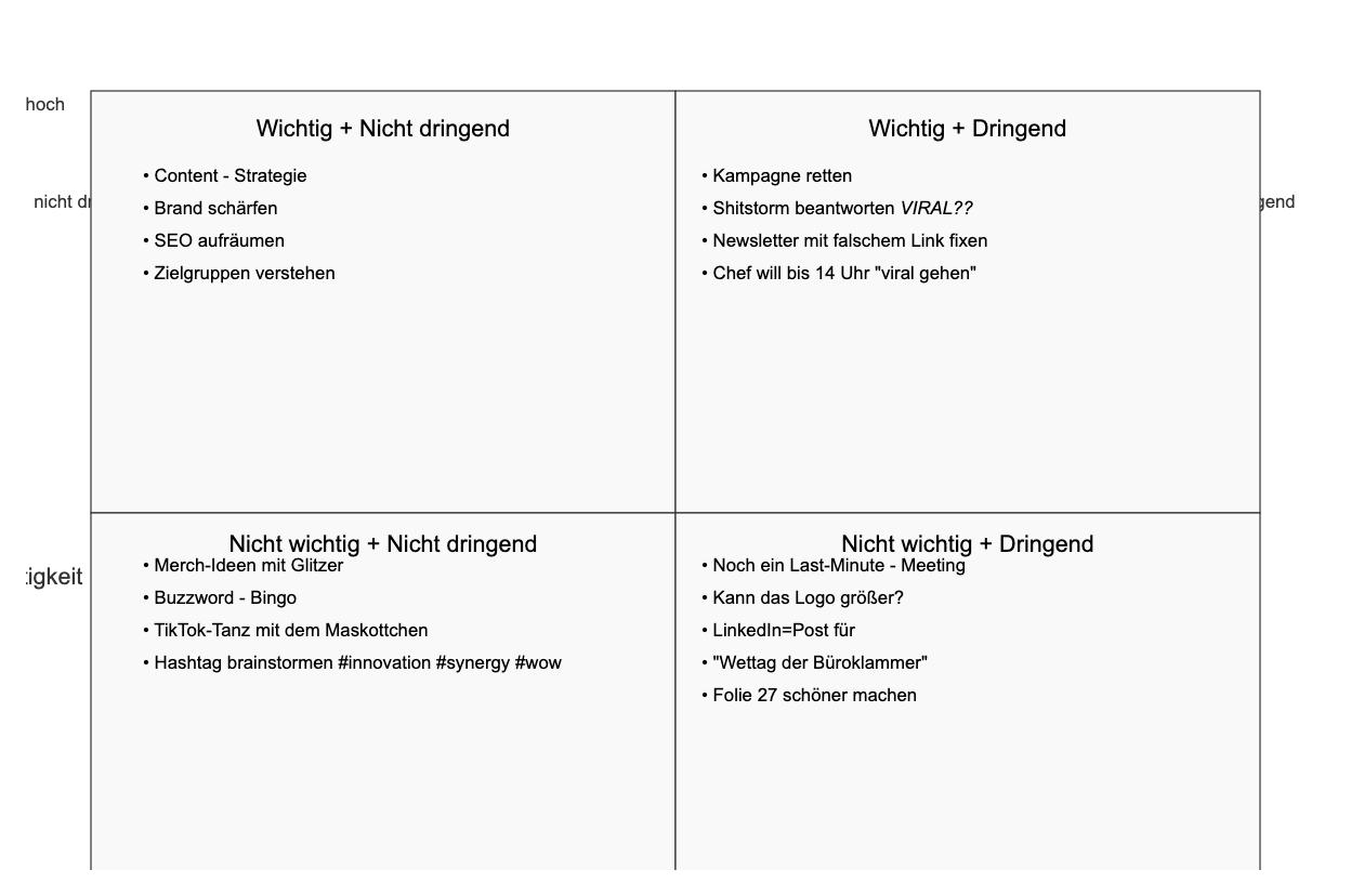Die 2×2-Eisenhower-Matrix mit allen vier Quadranten und den meisten Listenpunkten ist vorhanden, aber mehrere dekorative und kontextgebende Elemente aus dem Original fehlen: Titel, Achsenpfeile mit vollständigen Achsenlabels sowie die Skizzen/Icons am Rand. Die Quadrantenüberschriften und Inhalte sind überwiegend korrekt, jedoch sind einzelne Texte zusammengezogen oder abgeschnitten, etwa „Shitstorm beantworten VIRAL??“, die getrennte LinkedIn-/Weltag-Zeile und die links/rechts angeschnittenen Achsenbeschriftungen. Der Diagrammtyp und die Gruppierung passen gut, aber das Layout wirkt roh: große Leerflächen, abgeschnittene Randtexte und insgesamt deutlich weniger visuell ausgearbeitet als das Original.