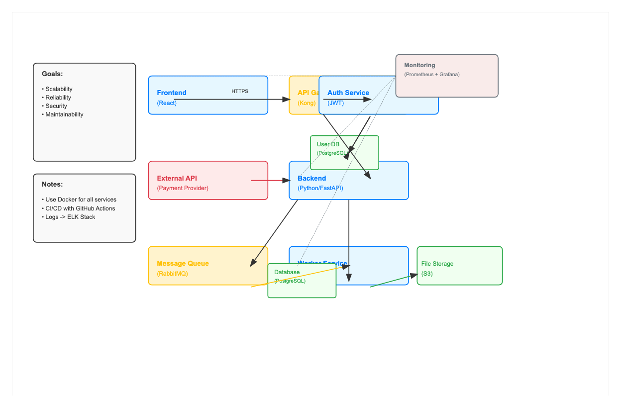 Fast alle wichtigen Elemente aus dem Original sind vorhanden, einschließlich Goals/Notes sowie der neun Service-/Storage-Knoten. Die Labels sind überwiegend korrekt, aber die Anordnung und Zuordnung der Knoten ist teils stark verfälscht: Monitoring steht oben statt unten, User DB und Database liegen über bzw. unter anderen Boxen, und mehrere Verbindungen gehen an die falschen Ziele. Besonders problematisch sind die Kanten: External API ist fälschlich mit Backend statt mit API Gateway verbunden, Monitoring ist mit vielen unpassenden Linien verknüpft, und mehrere Pfeilrichtungen bzw. Endpunkte stimmen nicht mit dem Whiteboard überein. Der Render bleibt als Architekturdiagramm erkennbar, wirkt aber durch Überlagerungen und kreuzende Linien deutlich unruhiger als das Original.