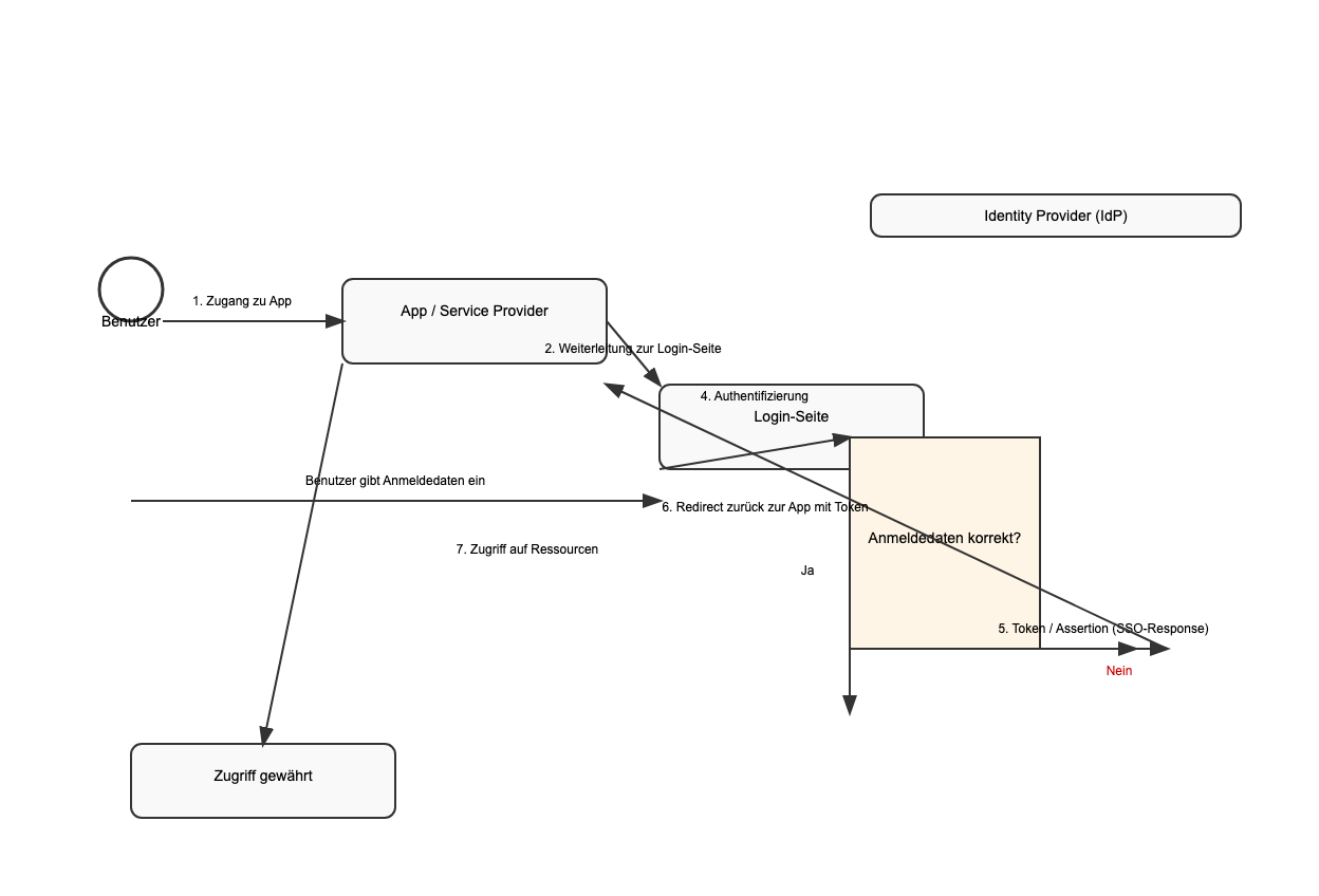 Fast alle zentralen Elemente sind vorhanden: Benutzer, App/Service Provider, IdP, Login-Seite, Entscheidungsknoten und „Zugriff gewährt“. Mehrere Beschriftungen sind übernommen, aber teils falsch zugeordnet oder schwer lesbar; besonders die Schritttexte 4–7 liegen nicht an den passenden Kanten, und „Nein“/„Ja“ sind inkonsistent platziert. Die Verbindungen stimmen topologisch nur teilweise: IdP ist nicht korrekt mit der Login-Seite verbunden, der Rückpfad zur App ist falsch geführt, und mehrere Pfeile kreuzen bzw. enden an unpassenden Stellen. Insgesamt noch als Ablaufdiagramm erkennbar, aber die Struktur des SSO-Flows ist im Render deutlich verfälscht.