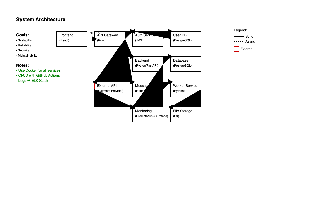 Fast alle Hauptknoten aus dem Original sind vorhanden, ebenso Goals/Notes und die Legende. Die meisten Labels stimmen semantisch, aber mehrere Texte sind abgeschnitten oder durch schwarze Flächen teilweise unleserlich, z.B. bei External API, Message Queue und Monitoring. Die Verbindungen sind stark fehlerhaft dargestellt: große schwarze Polygonflächen überdecken weite Teile des Diagramms, mehrere Kanten treffen die Boxen nicht sauber und die Pfeilrichtungen sind teils nicht mehr zuverlässig erkennbar. Der Architekturtyp bleibt erkennbar, aber die Lesbarkeit und visuelle Qualität brechen durch die massiven Rendering-Artefakte nahezu vollständig zusammen.