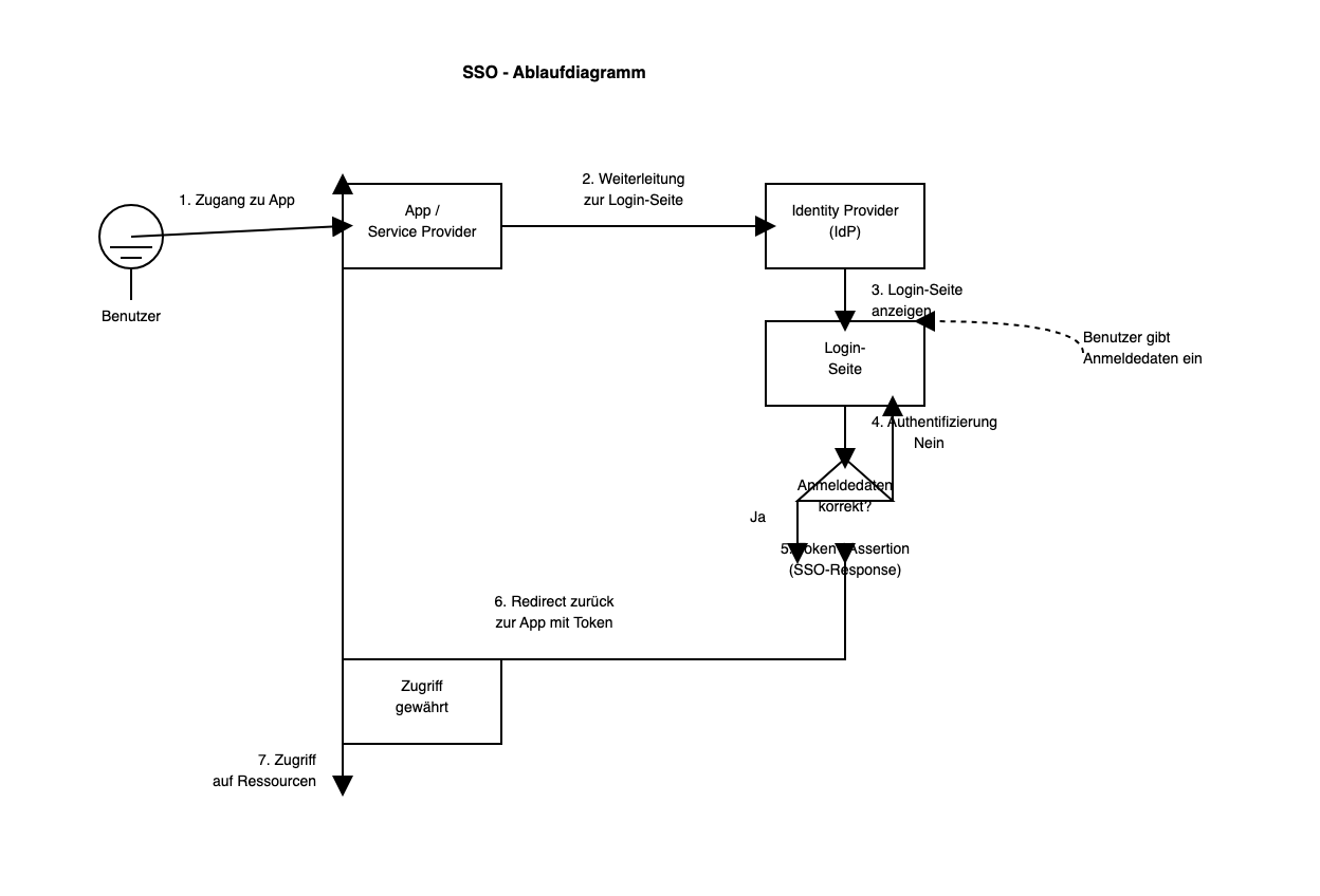 Die wesentlichen Elemente sind fast alle vorhanden: Benutzer, App/Service Provider, Identity Provider, Login-Seite, Entscheidungsdiamant und „Zugriff gewährt“ sind im Render erkennbar. Beschriftungen stimmen überwiegend, aber mehrere Texte sind ungünstig platziert oder schwer lesbar; außerdem ist der Benutzer als seltsames Kreis-Symbol statt als Strichfigur dargestellt. Kritisch sind die Verbindungen im rechten Teil: Der Rückweg vom Entscheidungsdiamanten zur Login-Seite und die Token-/Redirect-Strecke sind topologisch und in der Pfeilrichtung nicht sauber wie im Original, teils wirken die Pfeile vertikal falsch orientiert. Insgesamt bleibt es ein passendes Ablaufdiagramm, aber mit merklich chaotischerer Linienführung und geringerer visueller Politur als die Vorlage.