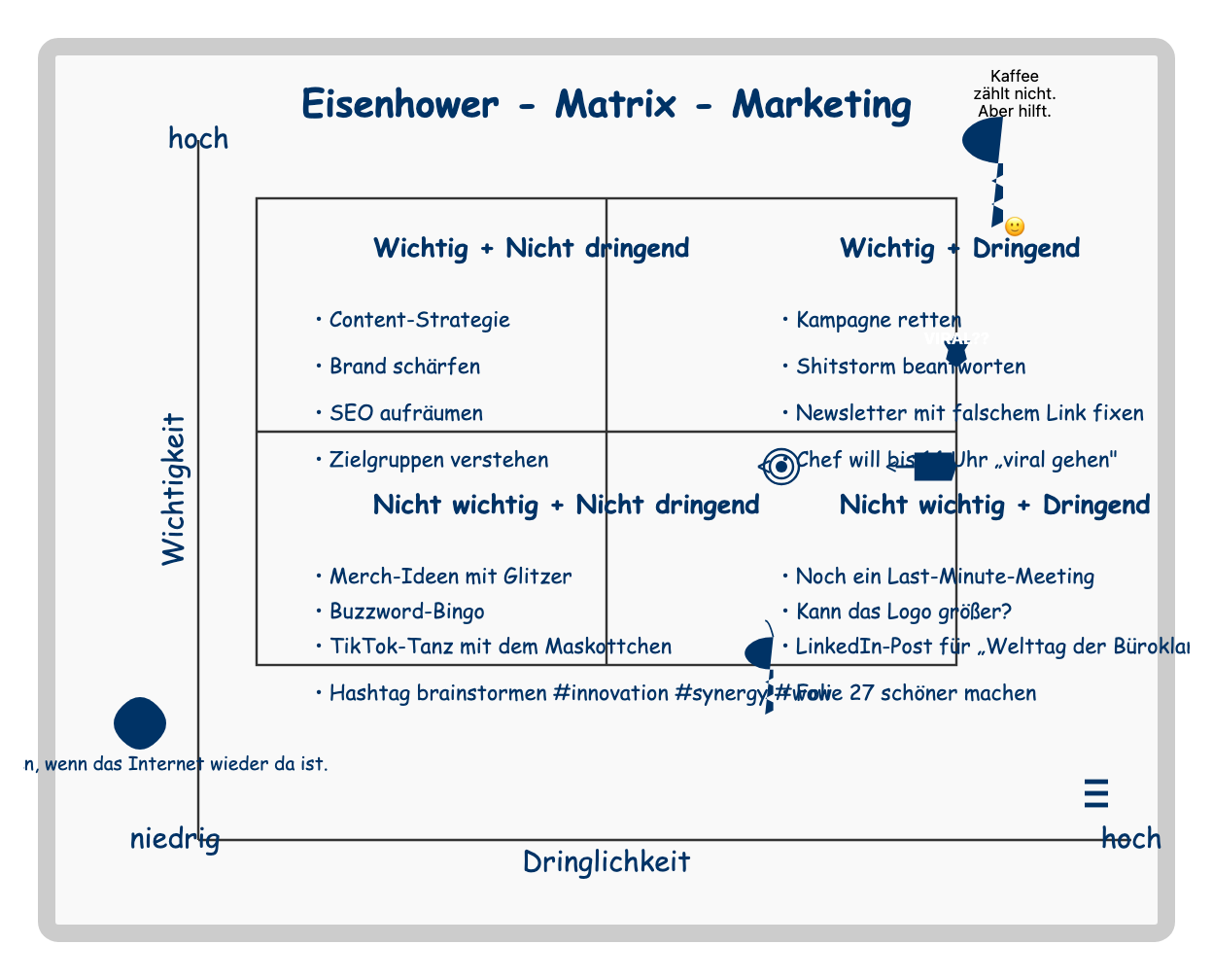 Die 2×2-Eisenhower-Matrix mit Achsen, vier Quadranten und fast allen Textinhalten ist grundsätzlich vorhanden; auch die Randnotiz zum Kaffee und mehrere Deko-Elemente wurden aufgegriffen. Allerdings sind einige Beschriftungen abgeschnitten oder überlagert, besonders rechts unten und links unten, und mehrere Illustrationen/Marker wirken verrutscht oder als dunkle Artefakte gerendert. Die Quadrantenstruktur stimmt gut, aber das Layout ist deutlich unruhiger als im Original: Überschneidungen bei Text und Symbolen sowie abgeschnittene Zeilen mindern Lesbarkeit und visuellen Eindruck stark.