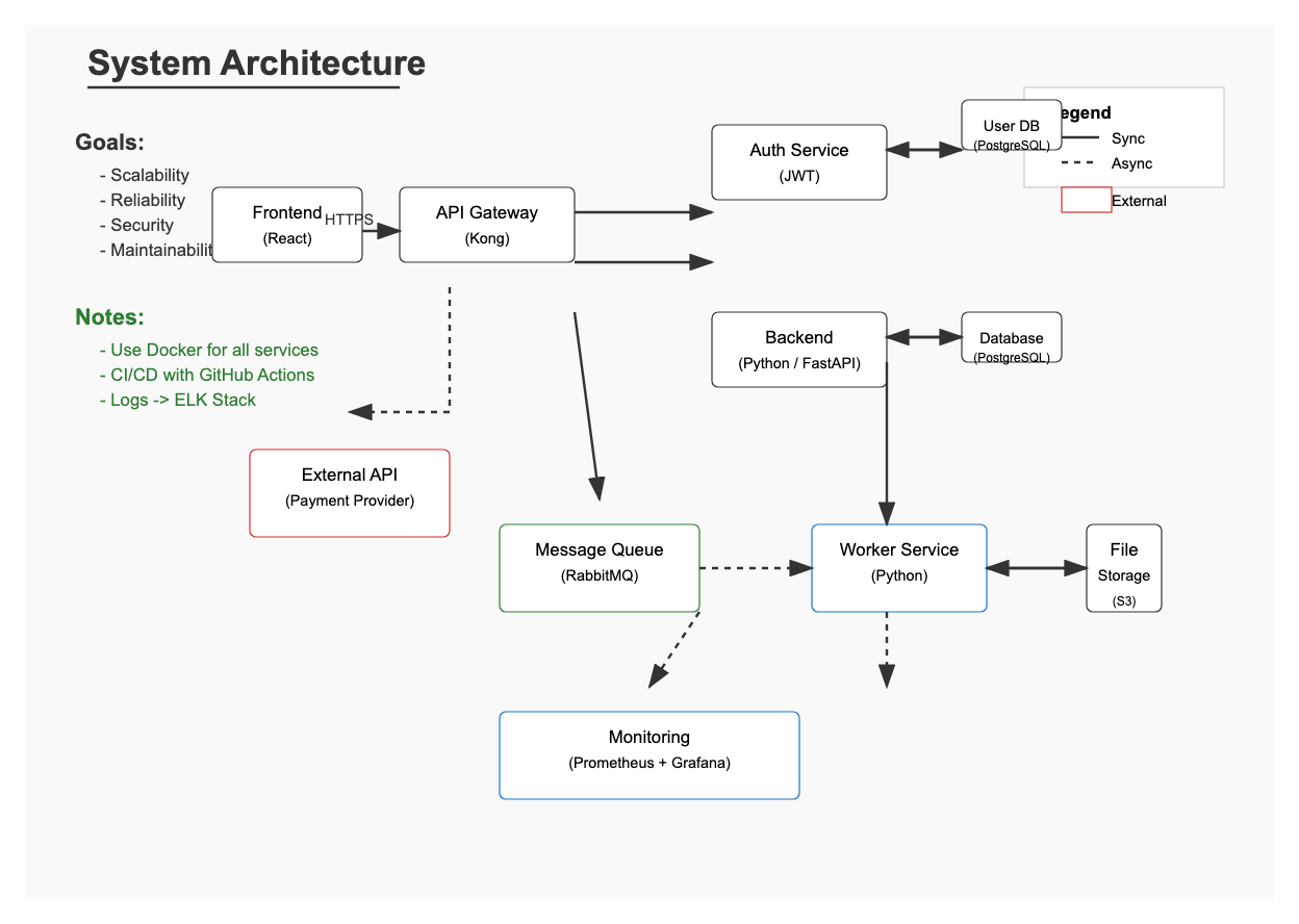 Fast alle zentralen Knoten aus dem Original sind vorhanden, inklusive Goals/Notes und Legende; lediglich die räumliche Zuordnung weicht teils ab. Die Labels sind überwiegend korrekt, aber „Worker Service“ steht an der Stelle von „Monitoring“, während „Monitoring“ nach links unten verschoben wurde. Mehrere Verbindungen sind topologisch oder richtungsmäßig falsch: API Gateway zeigt nicht klar zum Backend, Backend führt im Render zum Worker statt zur Message Queue, die gestrichelte Verbindung zur External API zeigt nach links statt nach unten, und die Monitoring-Anbindungen sind gegenüber dem Original vertauscht. Insgesamt bleibt der Diagrammtyp klar erhalten und der Render ist gut lesbar, aber die fehlerhaften Pfeile verändern den Datenfluss deutlich.