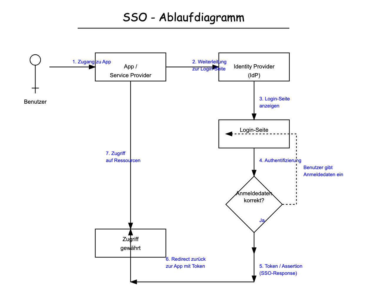 Fast alle wesentlichen Elemente aus dem Original sind vorhanden: Benutzer, App/Service Provider, Identity Provider, Login-Seite, Entscheidungsraute und „Zugriff gewährt“. Die Beschriftungen stimmen weitgehend, nur „Nein“ am Rücksprung zur Login-Seite fehlt sichtbar. Strukturell sind jedoch zwei zentrale Verbindungen falsch umgesetzt: Der Schritt 6 verläuft im Original von der Entscheidungsraute zurück zur App, im Render stattdessen unten entlang zur linken Seite, und der Schritt 7 führt im Original von „Zugriff gewährt“ nach oben zur App, im Render läuft die senkrechte Verbindung durch die Box und endet uneindeutig. Insgesamt gut lesbar und optisch ordentlich, aber mit klaren Topologie-/Richtungsfehlern im unteren Ablauf.
