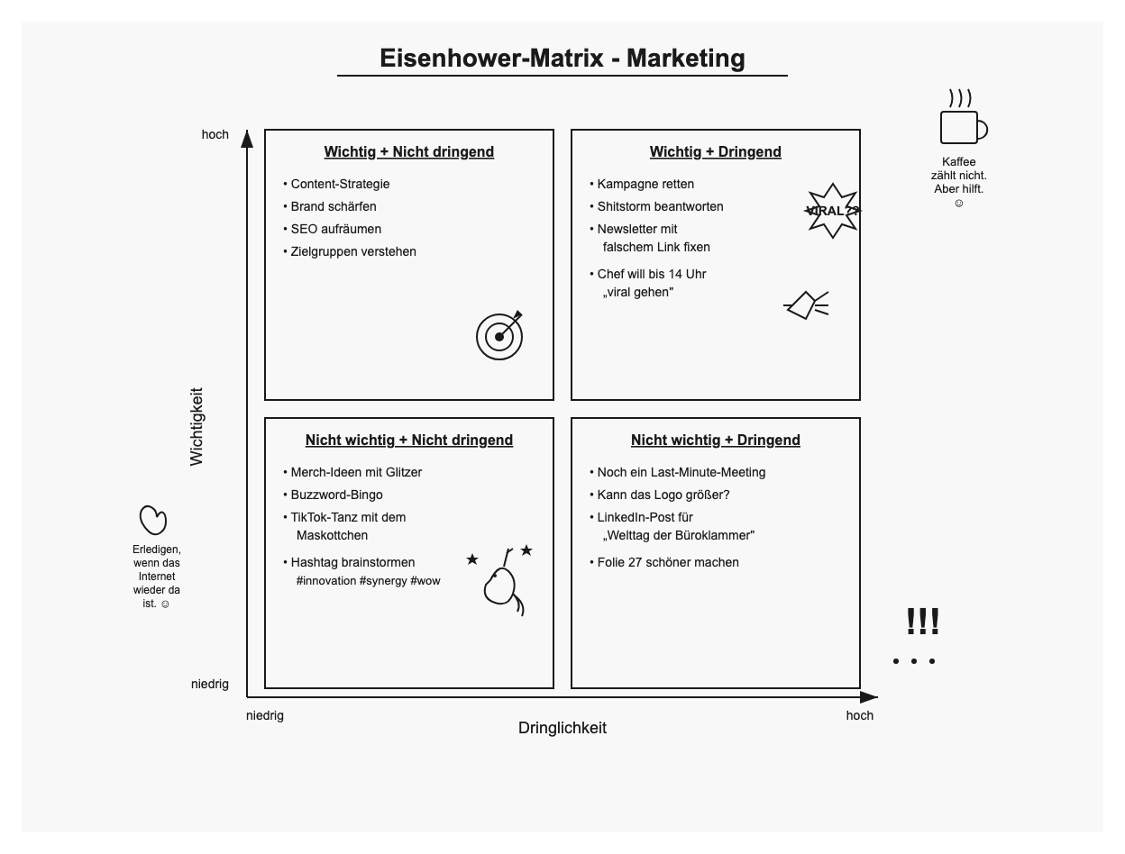 Die 2×2-Matrix mit Achsen, Quadranten, Titeln und fast allen inhaltlichen Stichpunkten ist vollständig übernommen. Die Beschriftungen stimmen weitgehend; kleinere Abweichungen gibt es beim Titel ohne Leerzeichen um den Bindestrich und bei einzelnen dekorativen Textdetails/Emoticons, außerdem ist die Sprechblase „VIRAL??“ etwas gedrängt. Gruppierung und Diagrammtyp passen sehr gut, da die vier Quadranten klar abgegrenzt und korrekt beschriftet sind. Das Layout ist sauber und gut lesbar, wirkt aber etwas roher und weniger handschriftlich-charaktervoll als das Original; einige Deko-Illustrationen sind vereinfacht.