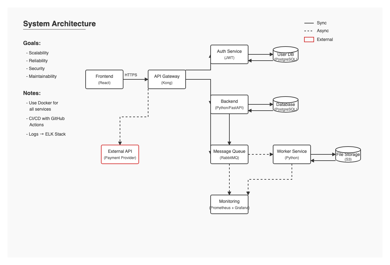 Nahezu alle wesentlichen Elemente aus dem Original sind vorhanden: Frontend, API Gateway, Auth Service, Backend, Message Queue, Worker Service, Monitoring sowie die drei Datenspeicher und die linken Listenblöcke. Die Beschriftungen stimmen fast vollständig; nur kleinere Unterschiede wie Typografie und leicht andere Zeilenumbrüche fallen auf. Die Verbindungen sind weitgehend korrekt, aber bei Auth/User DB, Backend/Database und Worker/File Storage sind bidirektionale Beziehungen mit klaren Gegenpfeilen gezeichnet, während das Original eher eine ungerichtete Doppelpfeil-/Austauschdarstellung zeigt; zudem wirkt der Monitoring-Zufluss unten etwas stärker formalisiert. Insgesamt sehr gut lesbar und strukturell passend, wenn auch etwas nüchterner und steifer als die Whiteboard-Vorlage.