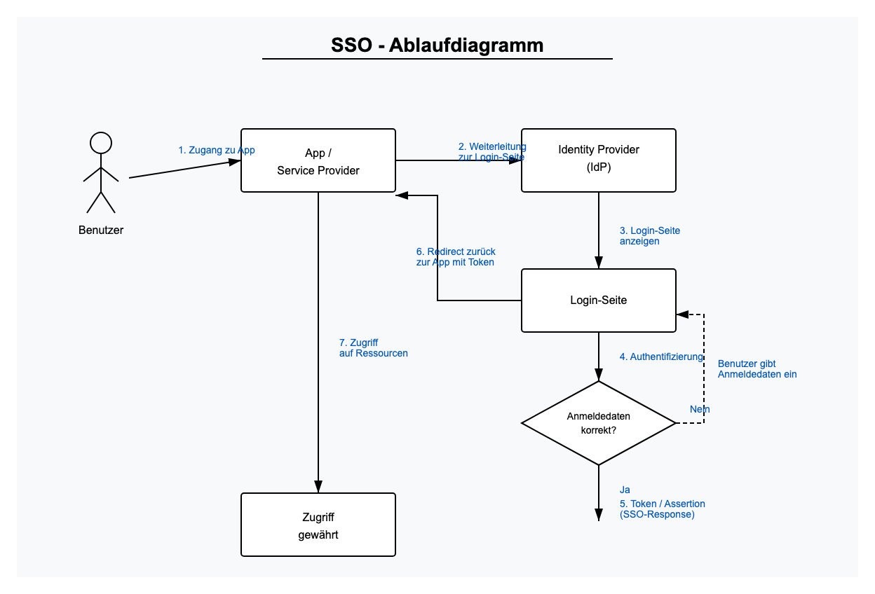 Fast alle wesentlichen Elemente aus dem Original sind vorhanden: Benutzer, App/Service Provider, Identity Provider, Login-Seite, Entscheidungsdiamant und „Zugriff gewährt“. Die Beschriftungen sind überwiegend korrekt, aber einige blaue Annotationen sind enger gesetzt bzw. leicht ungünstig platziert. Strukturell gibt es einen wichtigen Fehler: Der Rückweg „6. Redirect zurück zur App mit Token“ ist an die Login-Seite statt an den Entscheidungs-/Erfolgszweig angebunden, und der Pfad zu „Zugriff gewährt“ ist gegenüber dem Original deutlich anders verdrahtet. Insgesamt gut als SSO-Ablauf erkennbar und ordentlich gezeichnet, aber nicht topologisch originalgetreu.